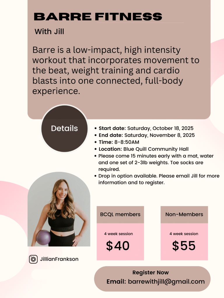 october, 2025 This is a repeating eventnovember 8, 2025 8:00 amBlue Quill Community League11304 25 Ave NW 18oct8:00 am8:50 amBarre Fitness Event Details Event Details Time (Saturday) 8:00 am - 8:50 am LocationBlue Quill Community League11304 25 Ave NW Organizer Barre ClassJillian Franksonbarrewithjill@gmail.com CalendarGoogleCal