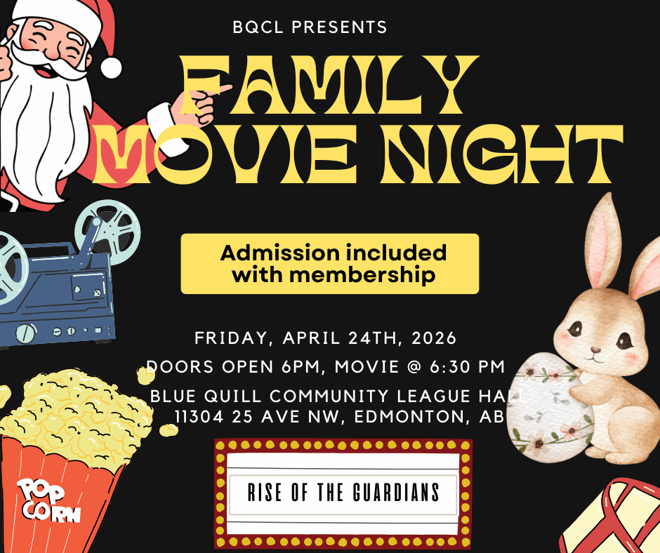 april, 2026 Blue Quill Community League11304 25 Ave NW 24apr6:00 pm8:30 pmFamily Movie Night - Rise of the Guardians Event Details Event Details Time (Friday) 6:00 pm - 8:30 pm LocationBlue Quill Community League11304 25 Ave NW CalendarGoogleCal