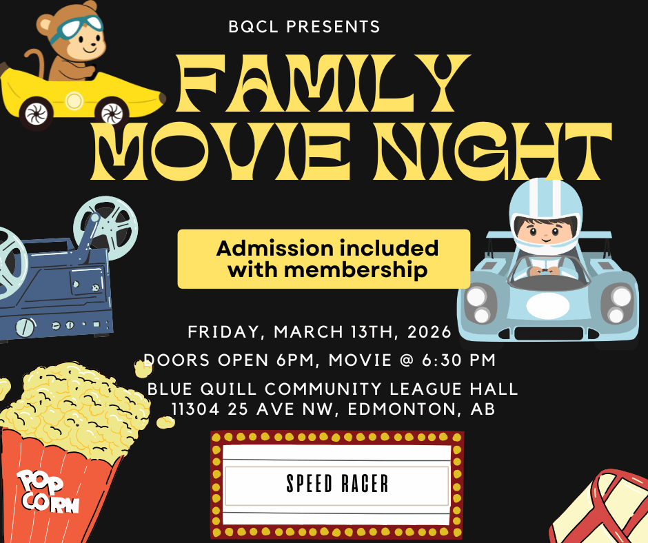 march, 2026 Blue Quill Community League11304 25 Ave NW 13mar6:00 pm8:30 pmFamily Movie Night - Speed Racer Event Details Event Details Time (Friday) 6:00 pm - 8:30 pm LocationBlue Quill Community League11304 25 Ave NW CalendarGoogleCal